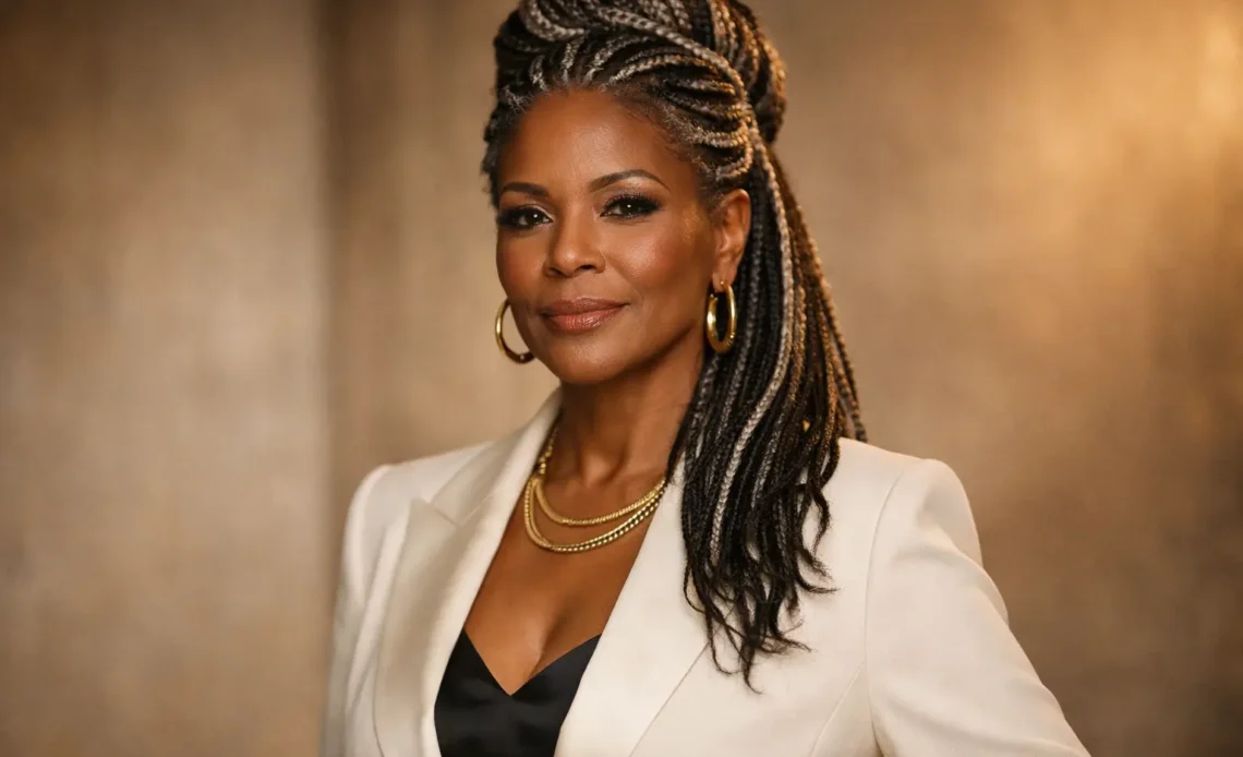 Fulani braids combine thin cornrows with hanging braids and decorative beads. This style is expressive, cultural, and visually striking for mature women.